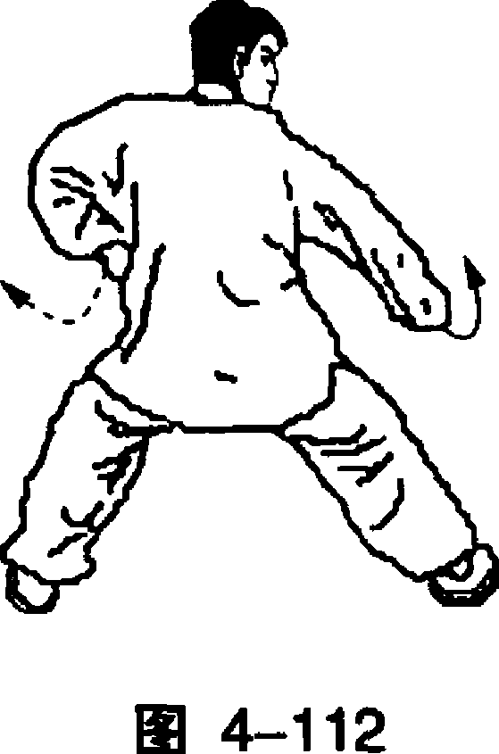 步型不变,左肘向左上提 拉,右拳成掌向里、向下、向外 横掌下切,掌心斜向下,掌指向 前。目视右掌方向。(图4-112)