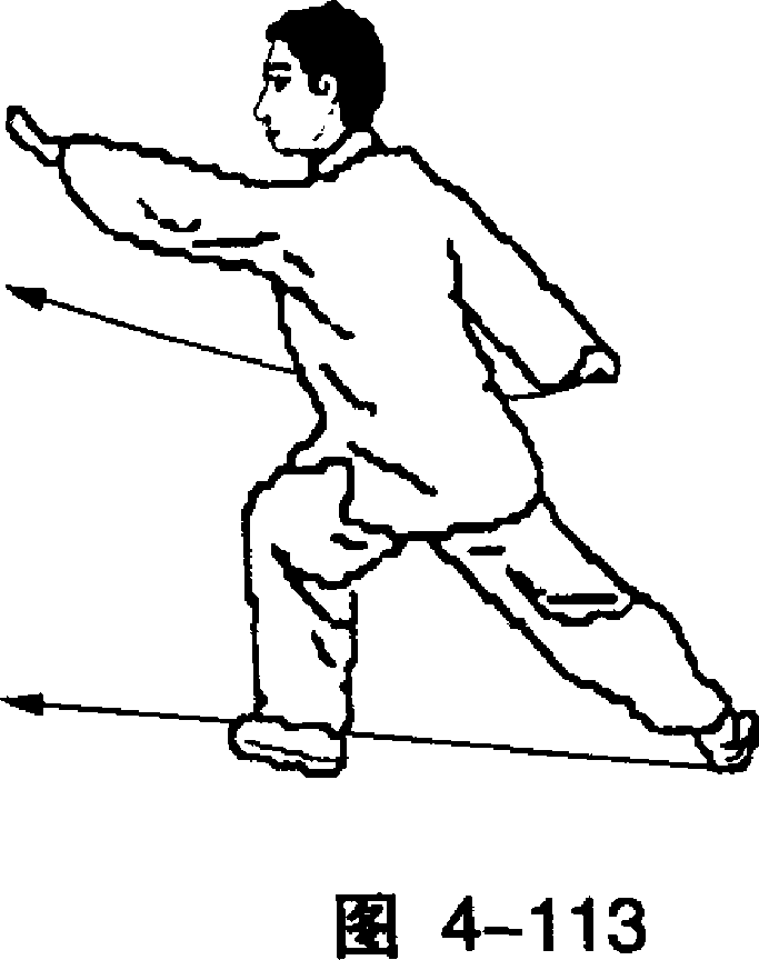 身体重心左移,上体左转, 左腿挺膝蹬直,成为左弓步;同 时左拳成掌直臂向前伸掌指向 前,掌心向下;右手成勾向后下 摆,勾尖向上。目视前方。(图 4-113)