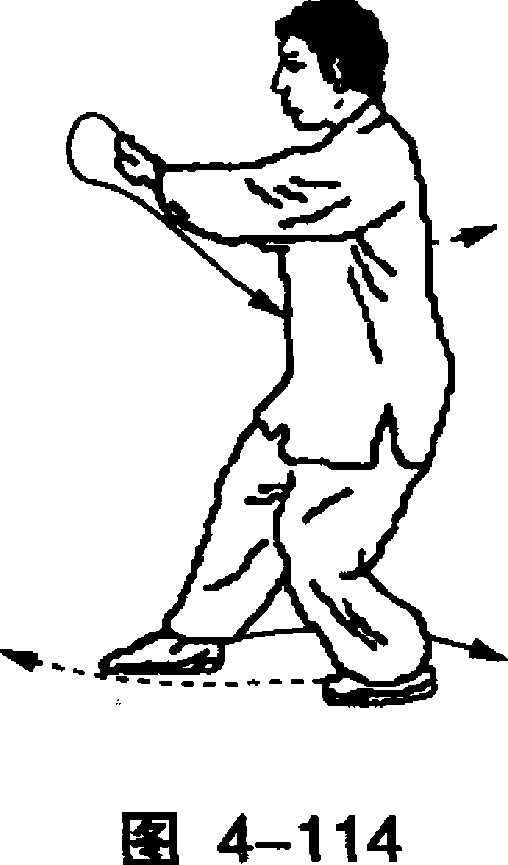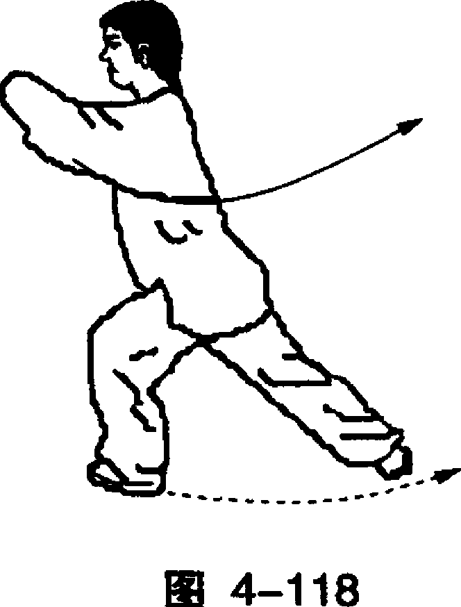 左脚从右腿后向右插步, 成为叉步同时两臂向后展撑 开;两拳拳心均向下,拳面向 左右两侧。目视右拳。(图 4-119)