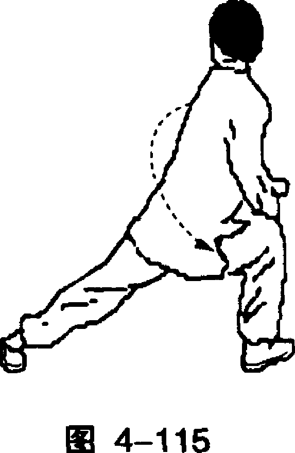 右脚下踏震步,左脚前上步,身体右后转,成为左弓步; 同时左手抓住右腕,做向右下的缠切动作。目视左方。(图 4-115)