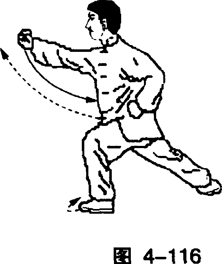 身体左后转,左腿屈膝半蹲,右腿挺膝蹬直,成为左弓 步;同时左手成拳,屈肘收抱于左腰侧;右拳直臂平肩向前直 臂冲拳,拳眼向上,拳面向前。目视右拳。(图4-116)