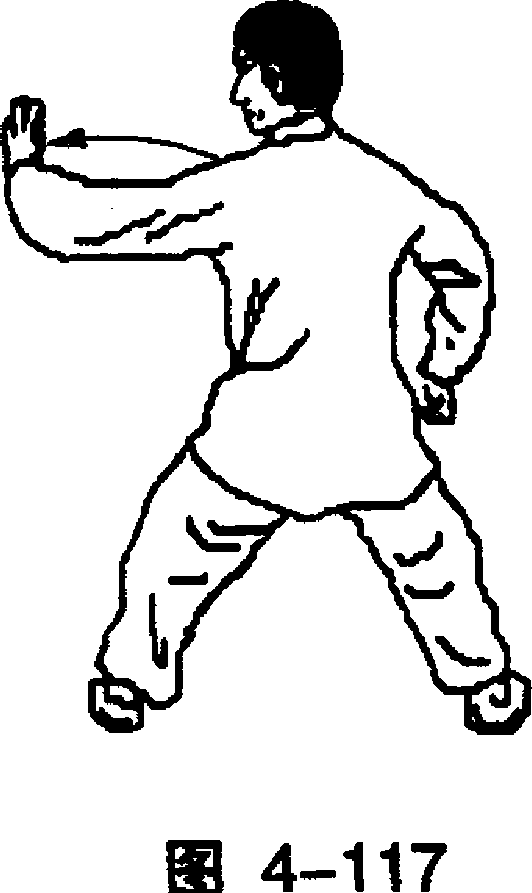 右腰侧,拳心向上,拳面向前;左拳成掌向右侧直臂平肩立掌 推出,掌指向上,小指侧向右。目视左掌。(图4-117)