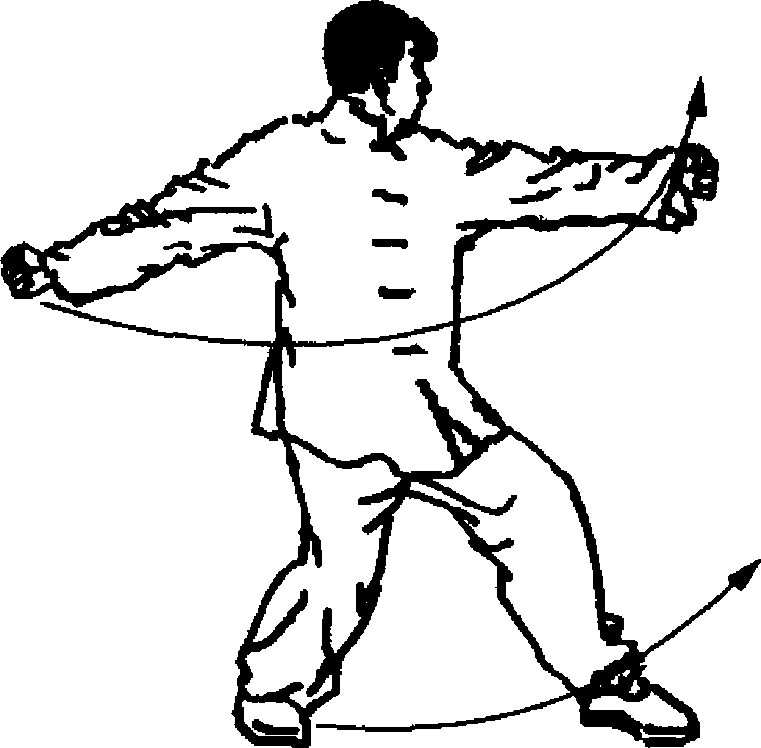 脚步不动,仍成并步, 两手抓握成拳,向里、向外