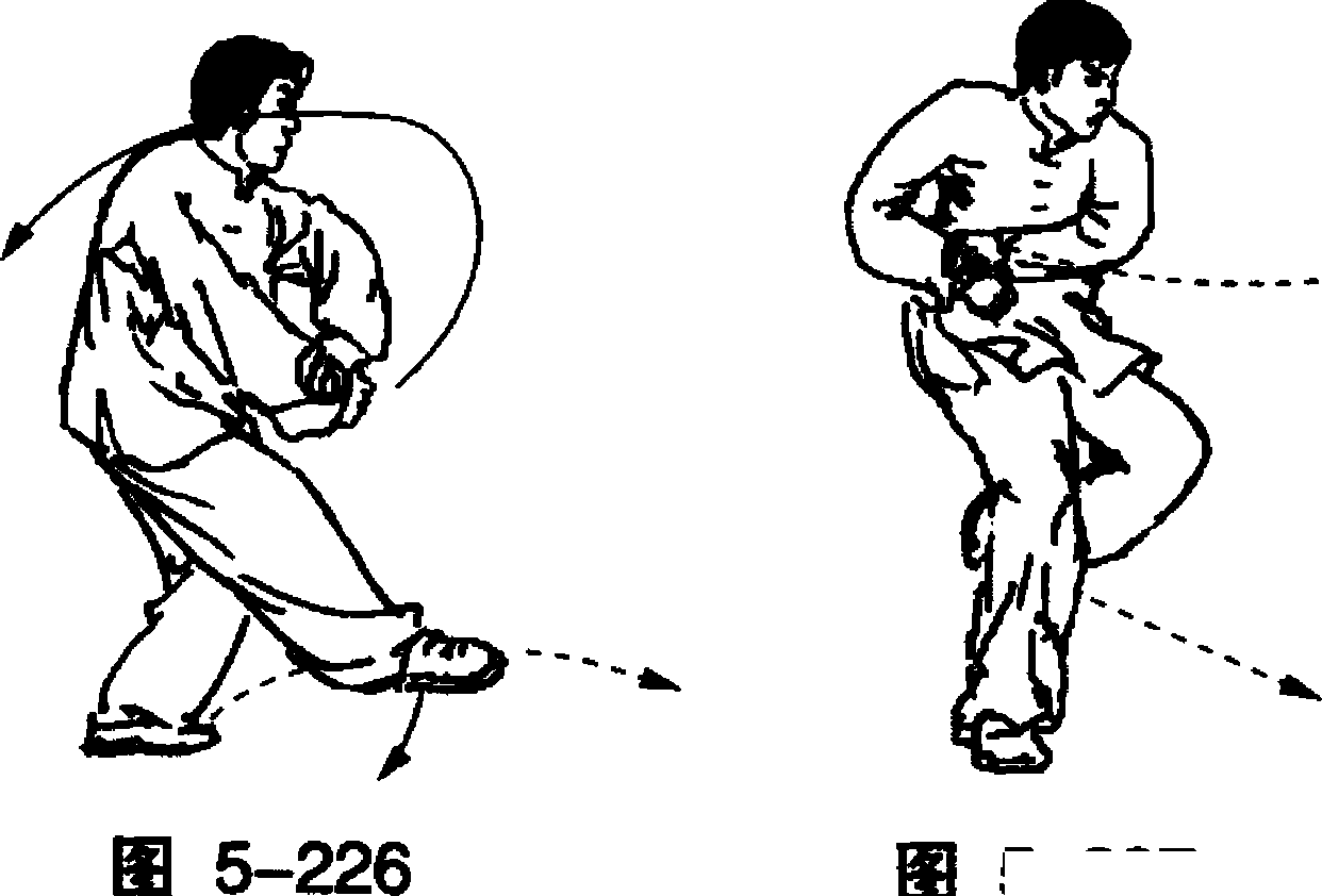 承上势,右脚上提经左腿前向左迈,同时,上体左转,两 臂(左掌仍握右腕)向下、向左。目视左前方。(图5-226)