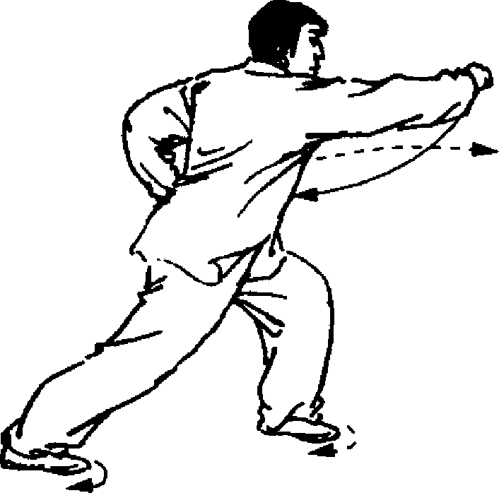 拳心朝上,左拳直臂向左腿挺膝蹬直成为右弓