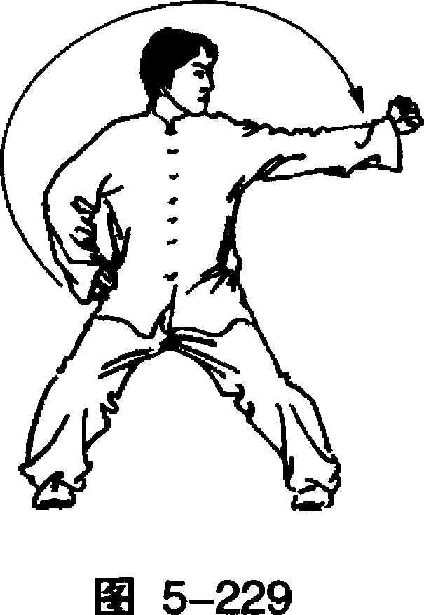 动作不停,左脚前上,屈膝半蹲,右腿挺膝蹬直成为左弓 步,同时,左掌松开成拳收抱于腰侧,拳心朝上,右拳直臂向 前冲出,拳面朝前,拳心朝下。目视右拳。(图5-228)