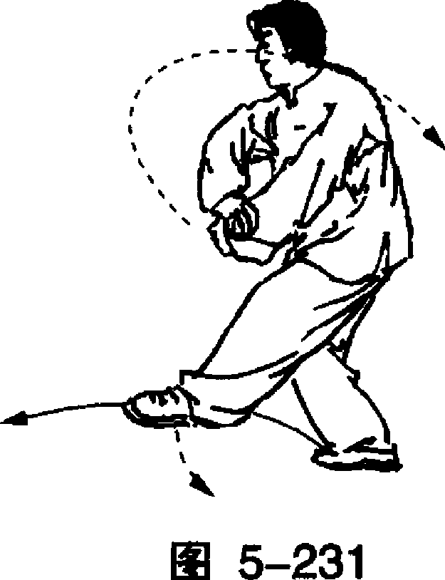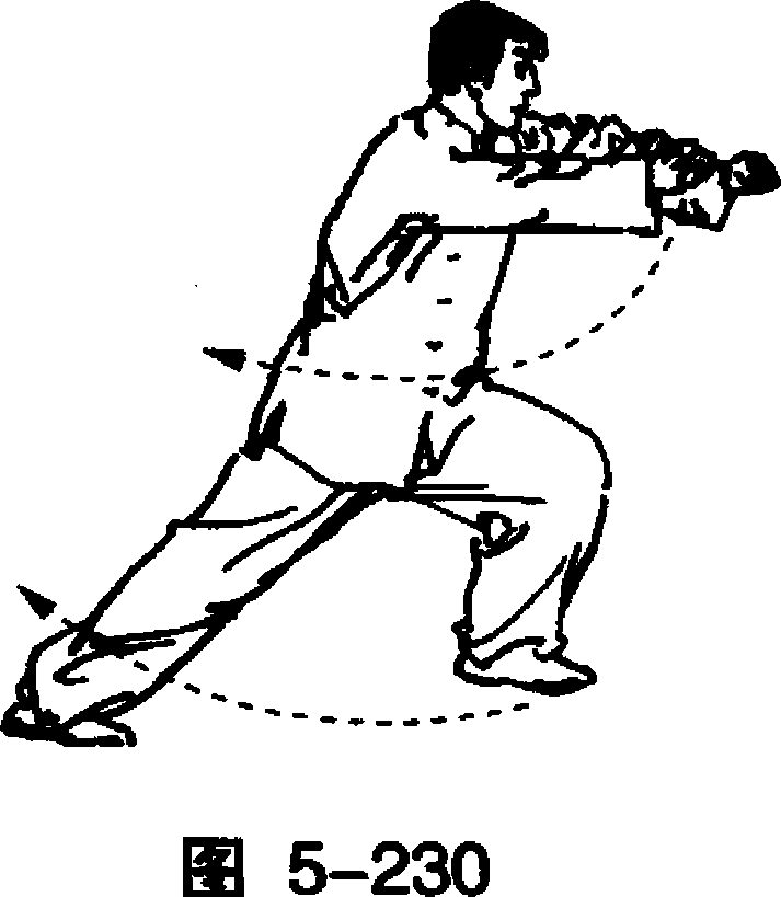 身体向左转,右腿挺 膝蹬直成为左弓步,同时, 右掌由后向上、向左抓握 左拳腕。目视右掌方向。 (图 5-230)