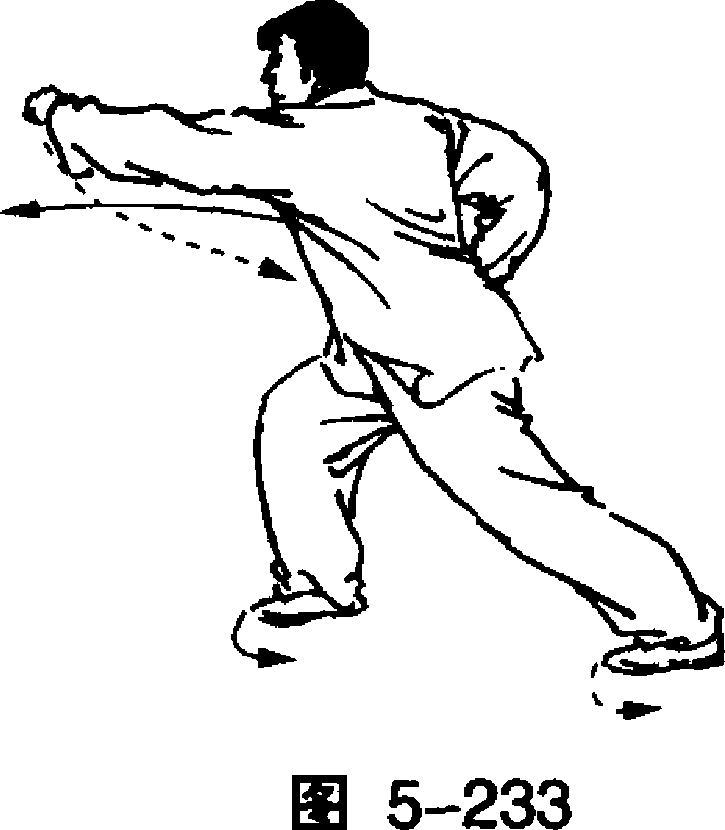 向下、向前于腰侧。目向下、向前于腰侧。目动作不停,左脚下震,右脚上提于左小腿内侧,同时,两 臂(右掌仍握左腕)继续向上、向后、 视右前方。(图5-232 )