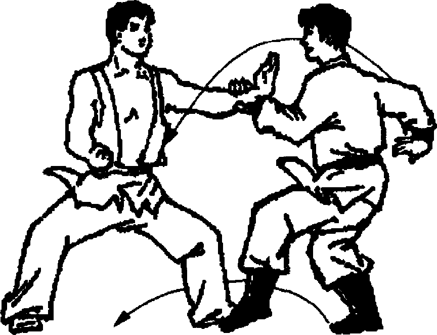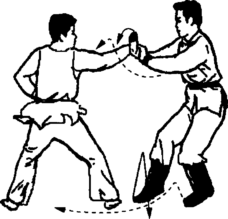 甲右手腕缠卷扣紧乙手腕并外拧,置于腹前,同时向右转 体90。,右脚震地,左脚上步于乙右腿后成马步。(图6-84)