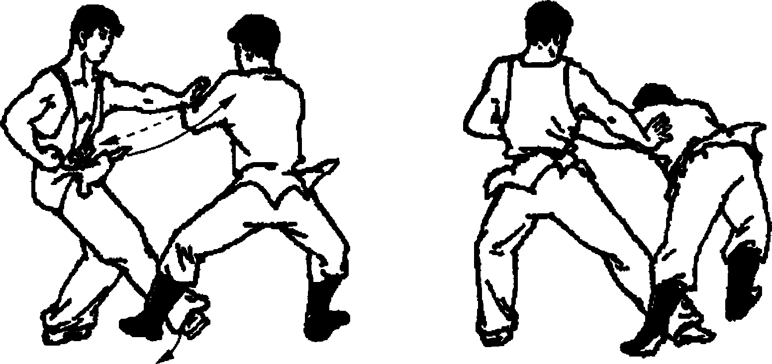 乙左手将甲左手拉回于腰间,右手向前下猛推甲左肩胛 骨,同时上体左转90。,右脚后挂甲左脚(上、下肢配合一 致),使甲前倒用右手扶地。目视对方。(图6-86)