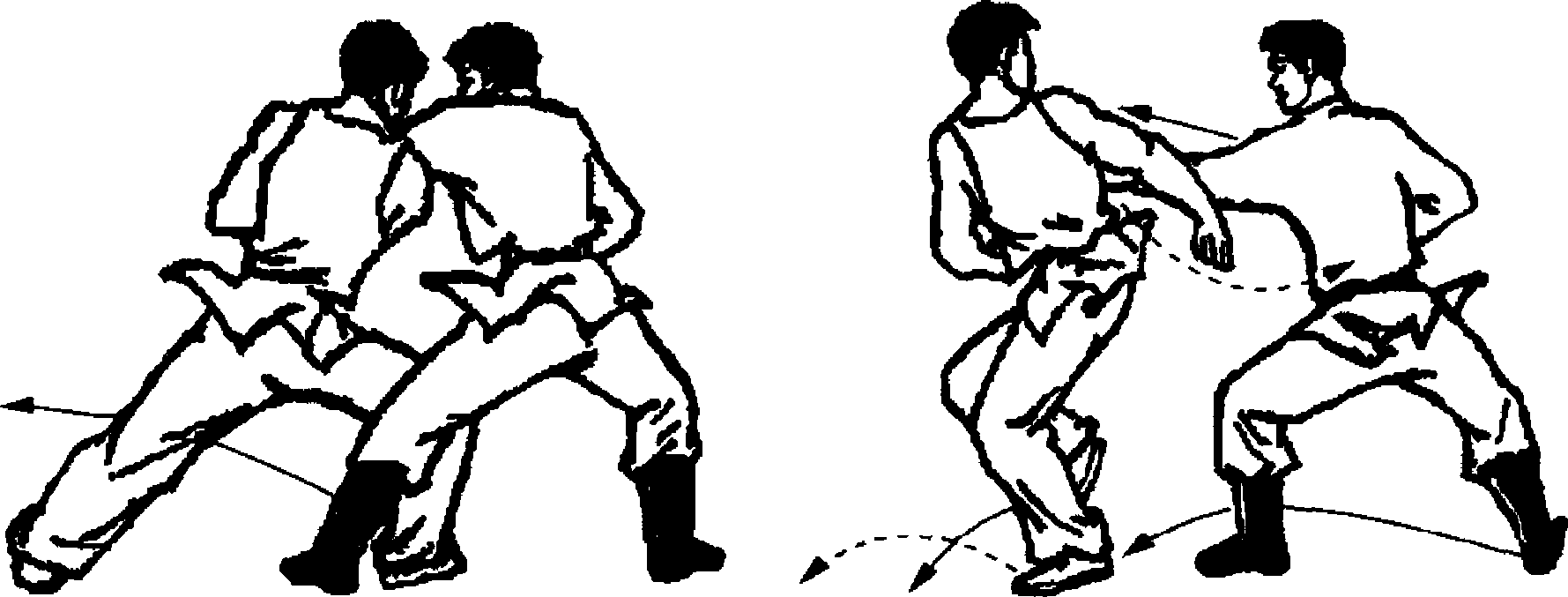 甲速滑转左肩解脱乙的右掌,同时起身,乙左手不放,右 腿前弓,抵在甲左腿前并速进右肩短促有力地撞击甲左肋。 (图 6-87 ) '