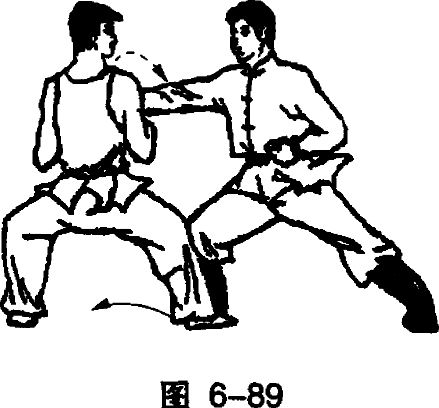 一步成马步,同时,甲速上右 脚成右弓步,左拳抱腰,拳心 向上,右掌向前直臂推击甲右 胸。目视对方。(图6-89)