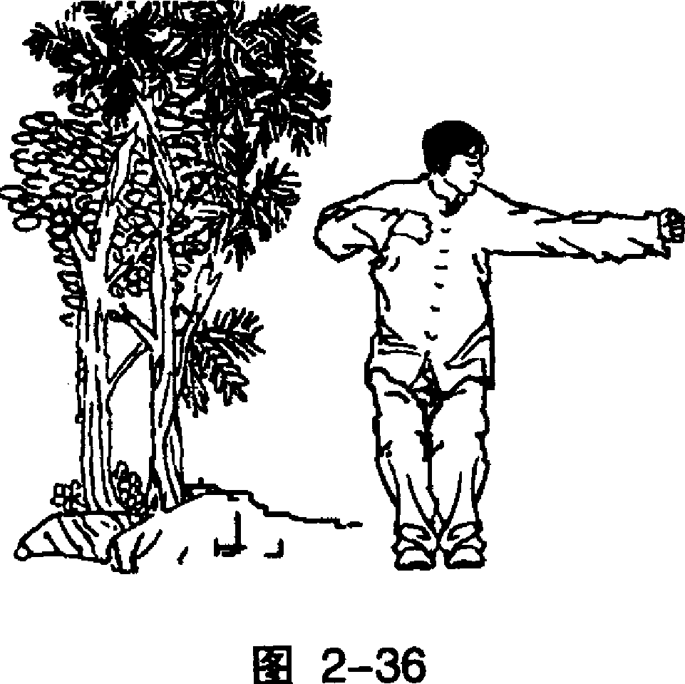 肩平,拳眼向上。右臂 屈肘向右顶出,右拳屈 于胸前与肘平行,拳眼 向上。上体自然正直, 头向左转。目视左拳。 (图 2-36 )