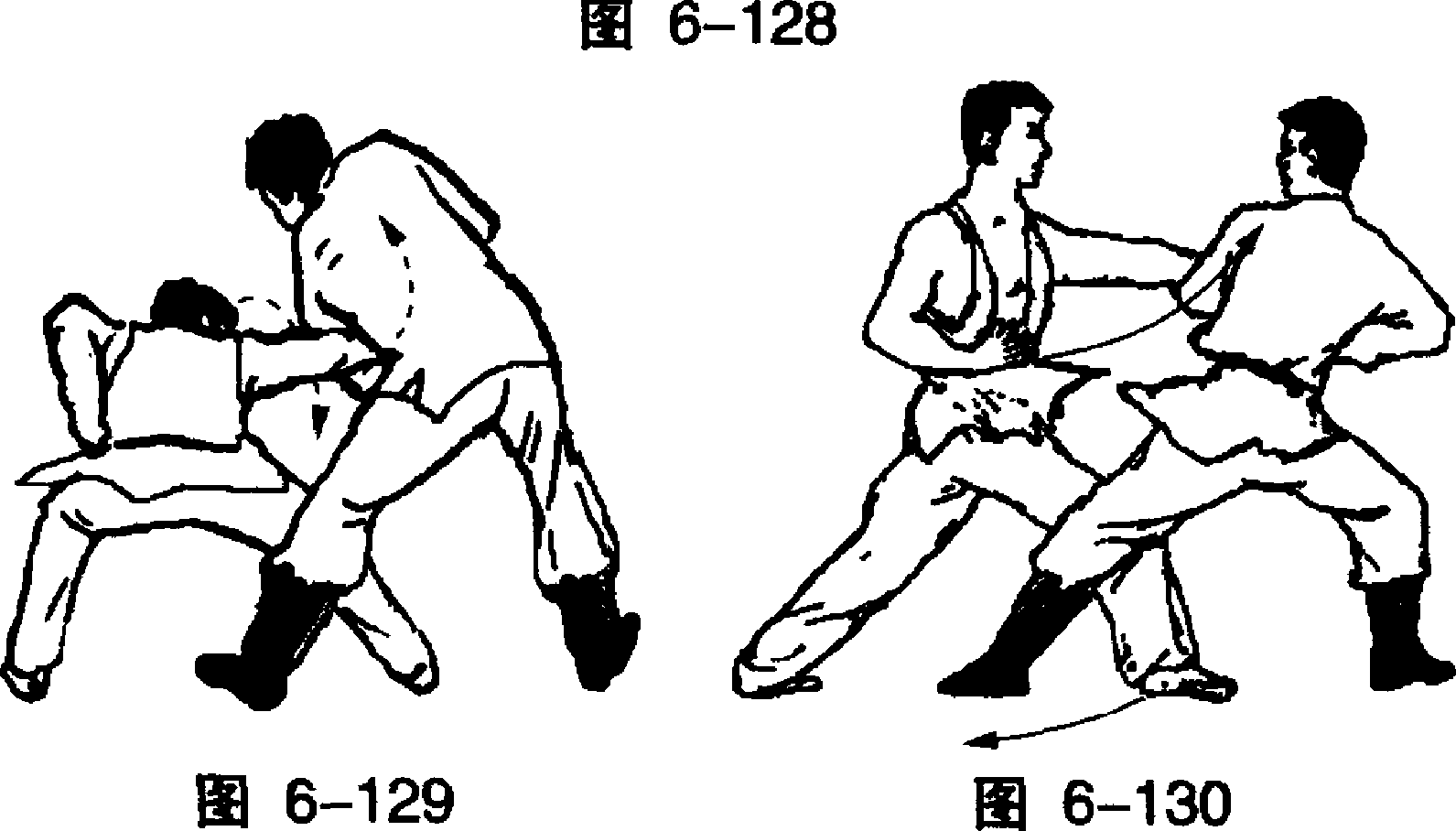 乙左手将甲左手拉回于腰间,右手向前下猛推甲左肩,同 时上体左转90。,右脚后挂甲左小腿,使甲前倒,用右手扶 地。目视前方。(图6-131)