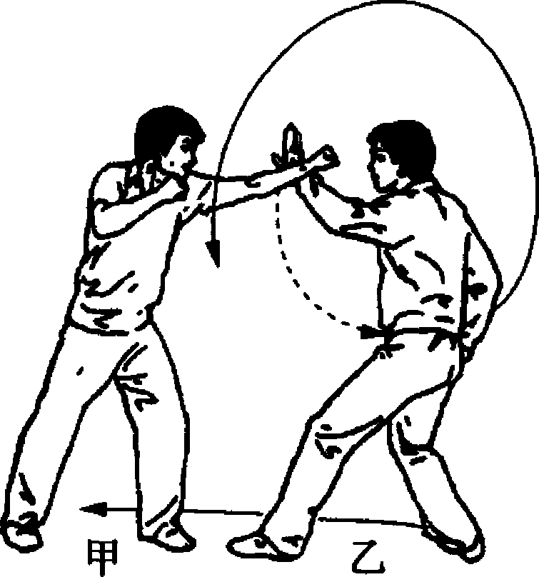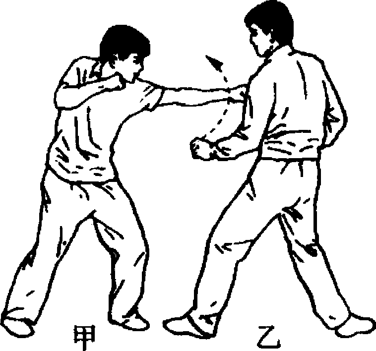IIII甲、乙双方左高三体式对立为备战势;甲左脚前上半步,K. ■K. ■7-497-497-507-50K. ■K. ■7-497-497-507-50同时用左拳击打乙胸部。(图7-49)