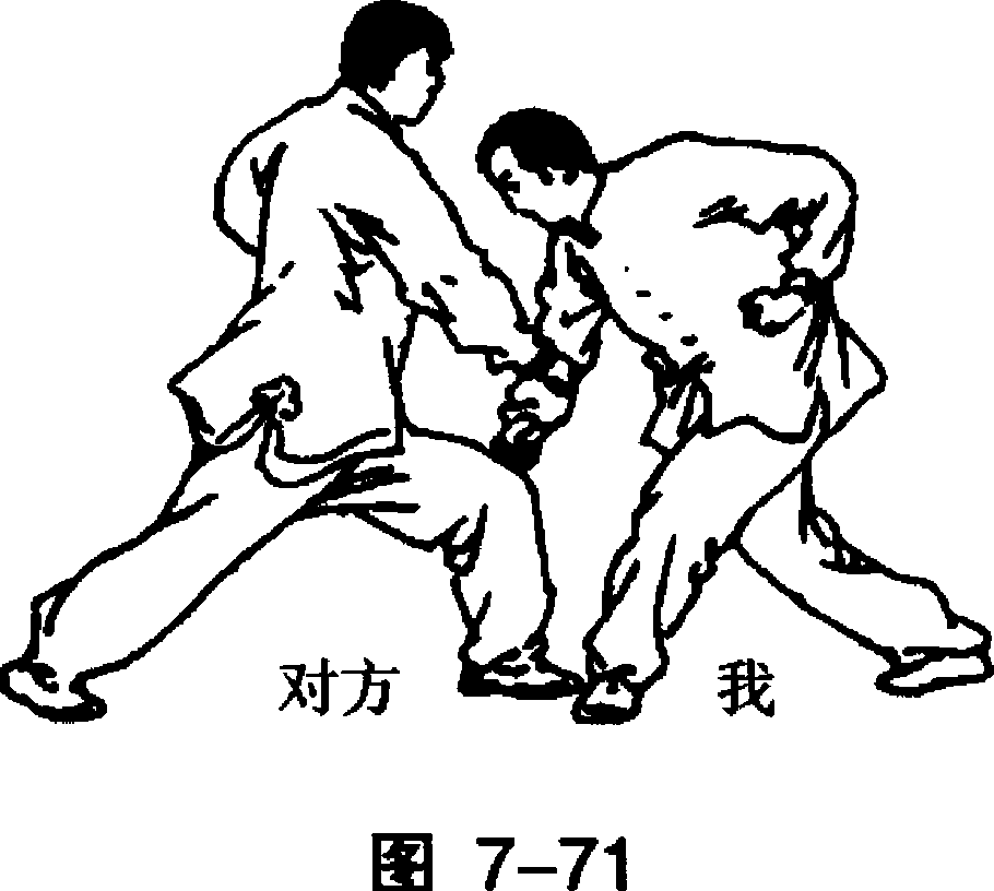 接着,双方同时上右脚,我右脚前上步于对方身后,同时 用右肩靠撞对方右肋部,使对方肋伤。(图7-72)