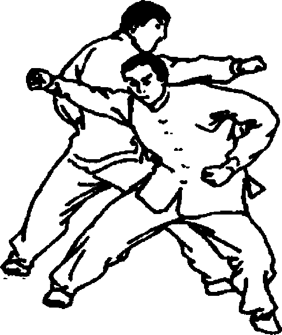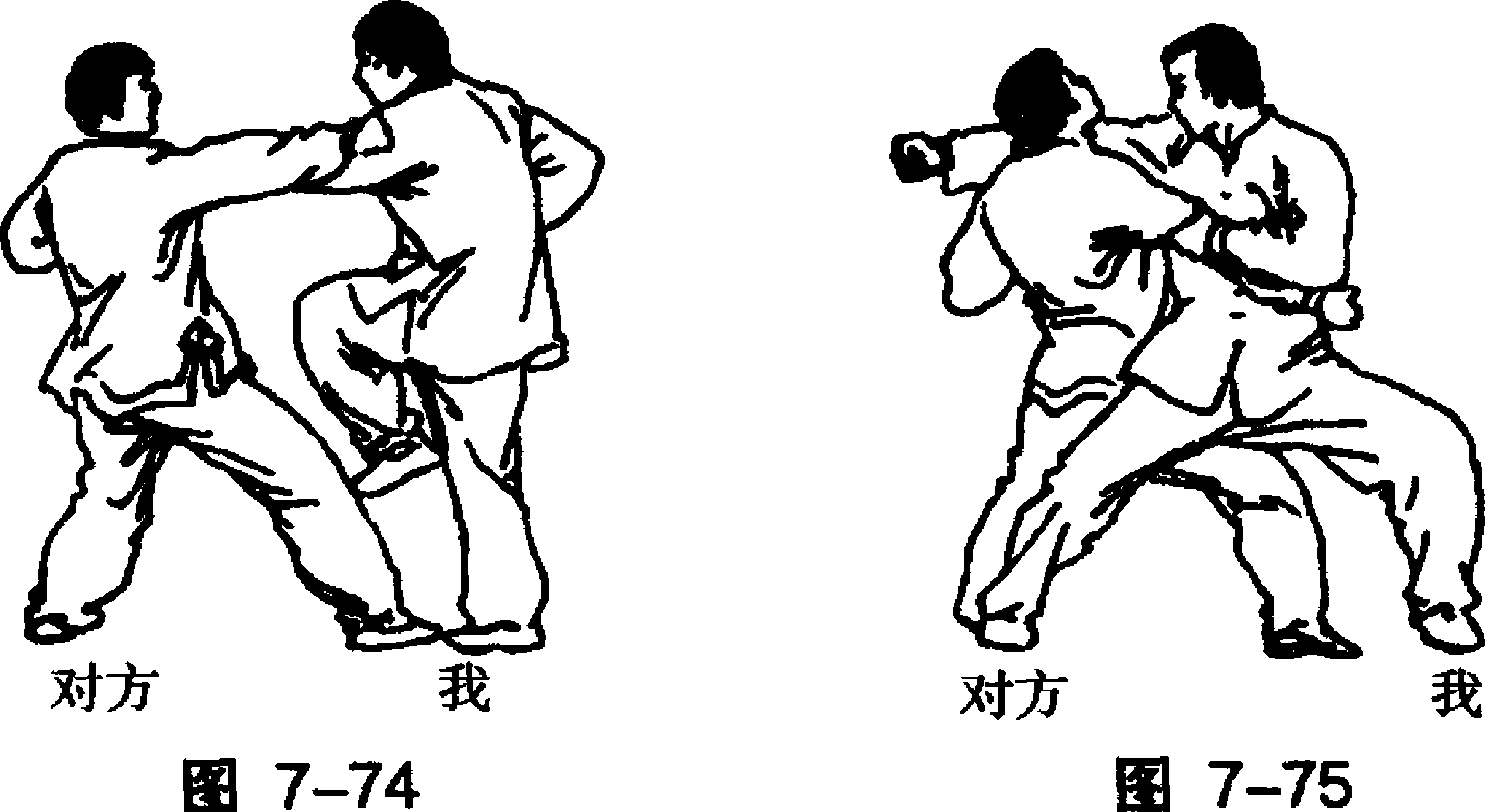 双腿,右臂从对方胸前伸过,并用右胸前靠击对方胸部,使对
