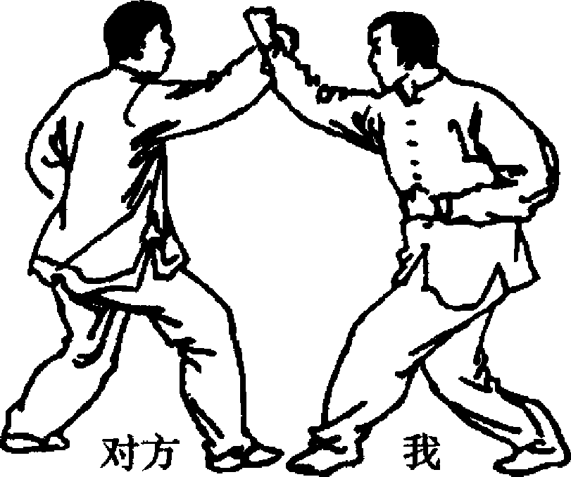 身体,左脚提起准备前上步,左掌向左前推对方右上臂,右拳