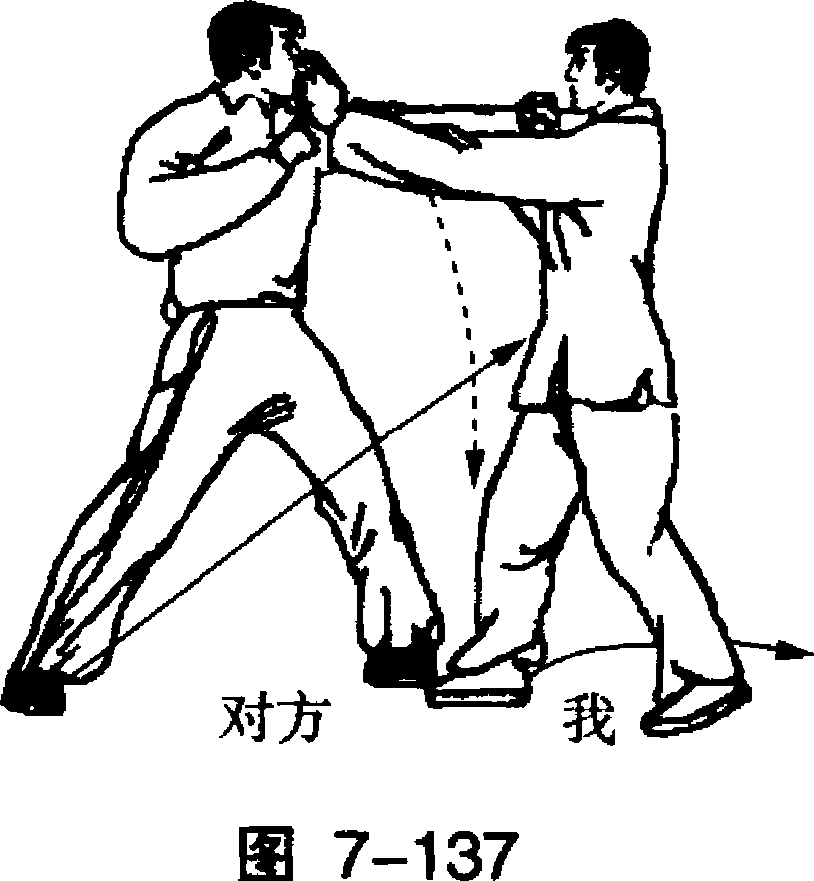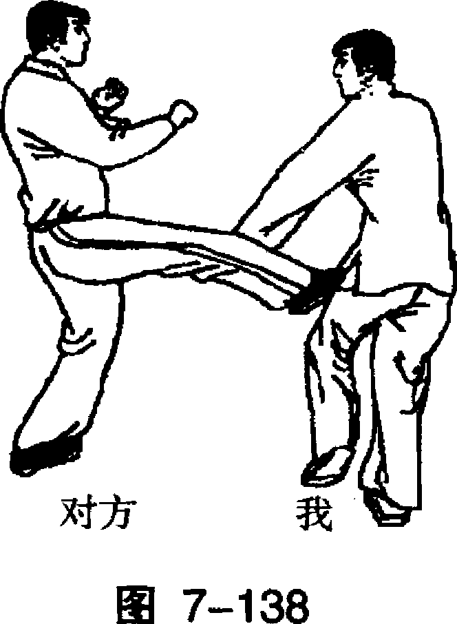 U!U!丁步下斩丁步下斩7-136腹部° (图7-136)要点:架臂防拳要 及时,侧踹要快速有力。对方前上左步,用 左拳击打我胸部;我速 用右臂格开来拳,用左 掌抓击对方面部。(图 7-137)对方速用右脚弹踢 我裆部;我速后退右脚 成为丁步,左掌成拳向 下斩击对方弹踢腿。 (图 7-138)要点:格防来拳要及时,抓对方面部要准狠,下斩防拳要快速。