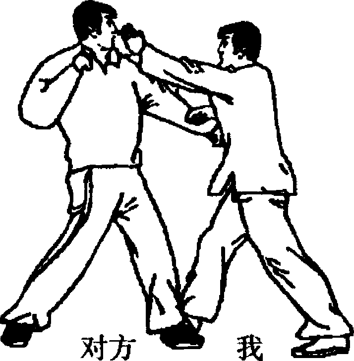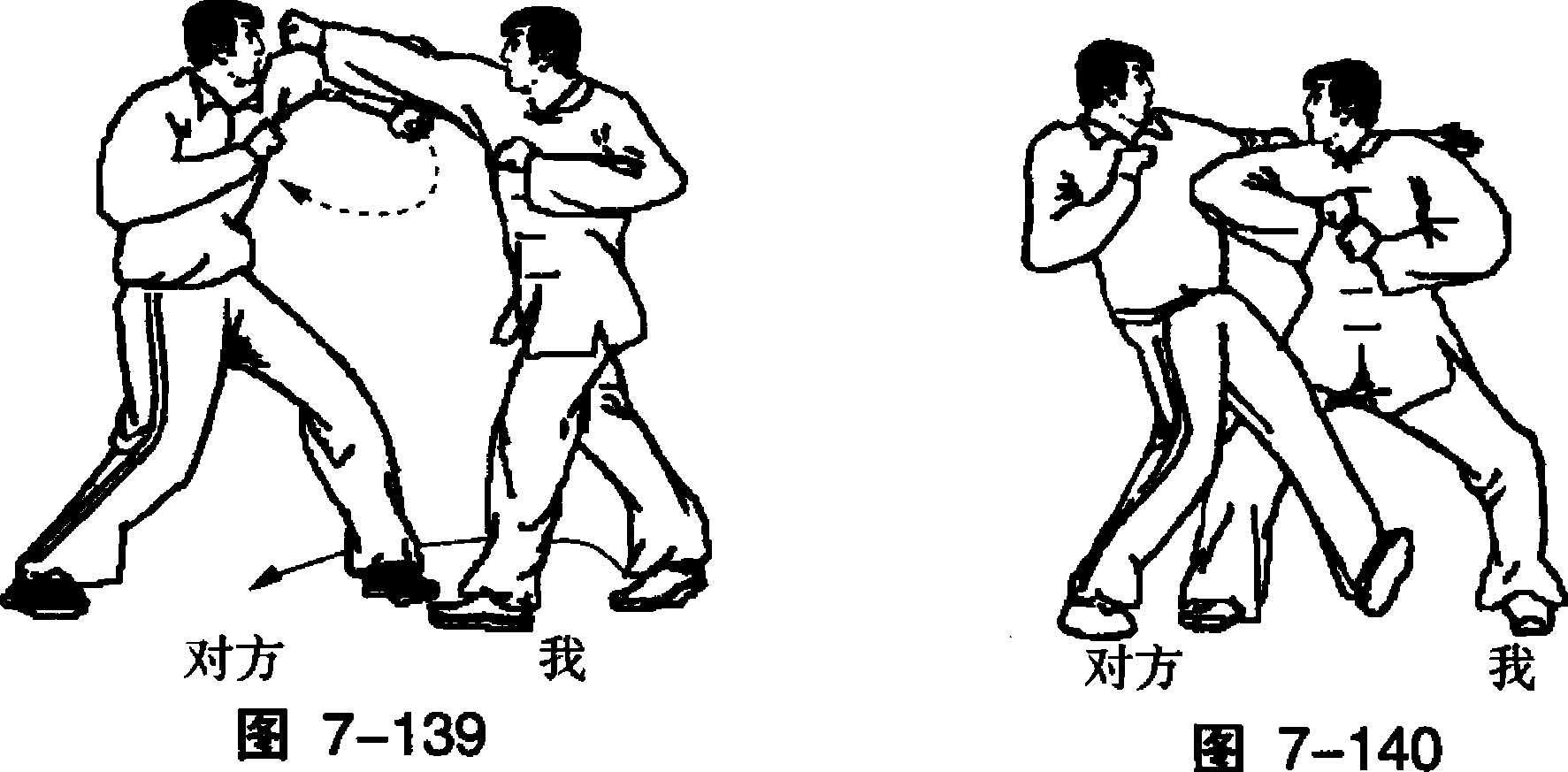我上左步用右直拳击打对方面部;对方用左臂上架。(图 7-139)我进右步于对方左脚之后,用右肘顶击对方胸部。(图 7-140)要点:动作要连贯、快速有力,顶击要猛狠。7-1417-1417-1417-141