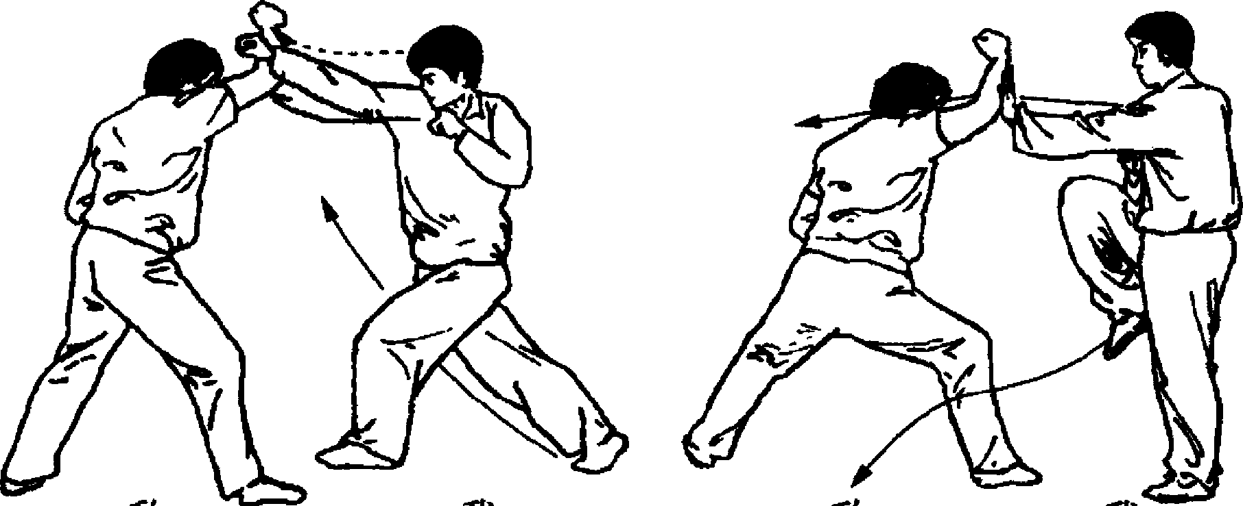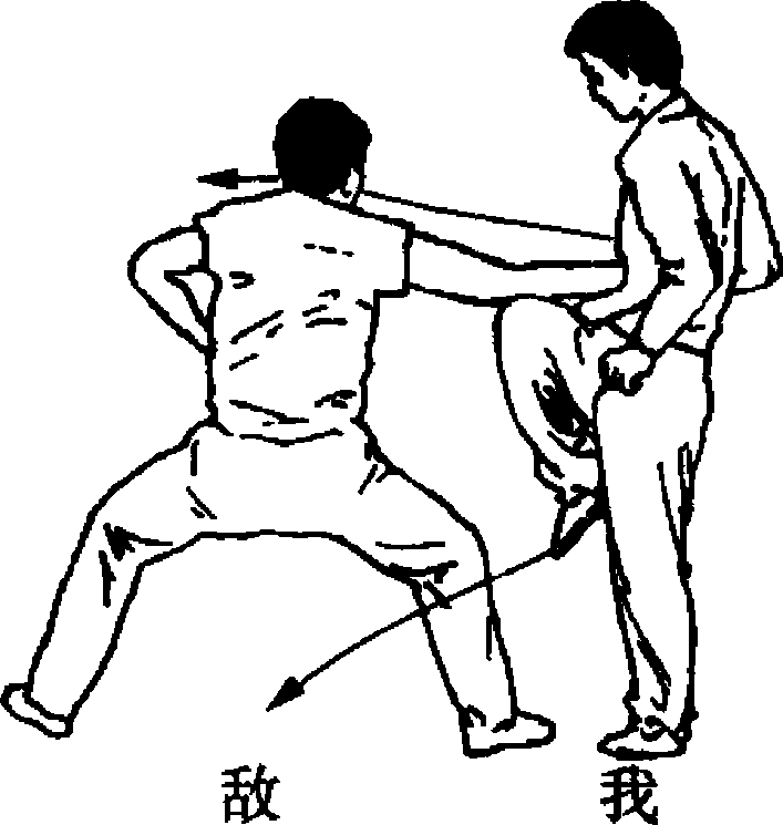 右侧过敌后颈伸出,并用右腋靠撞敌方胸部,使之后摔。(图