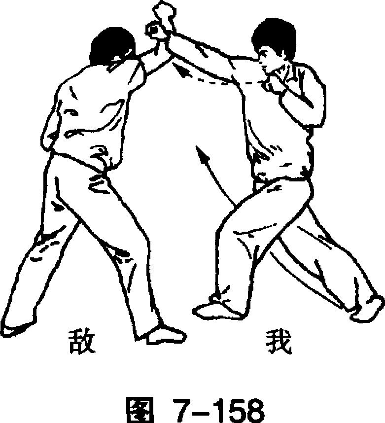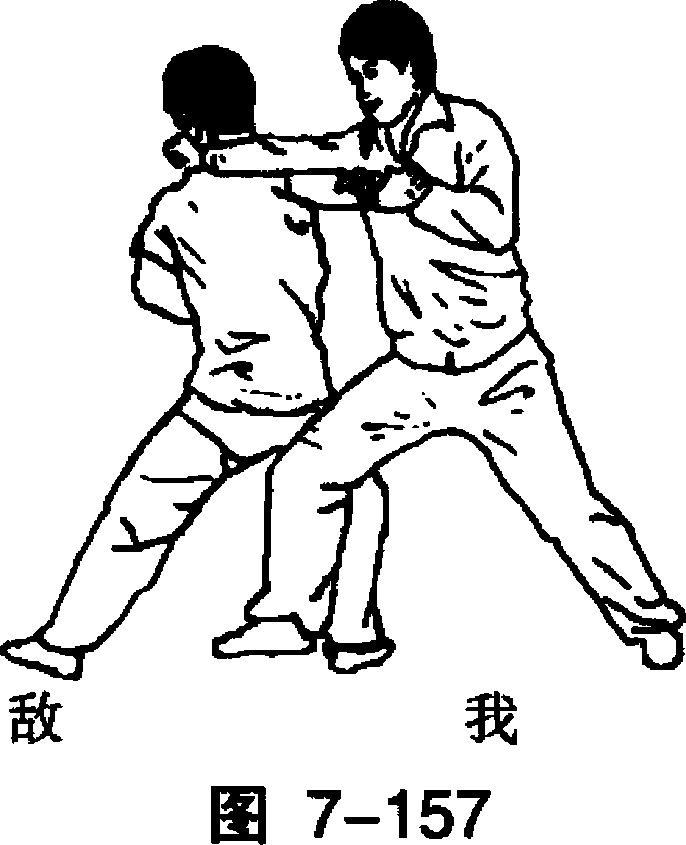 右侧过敌后颈伸出,并用右腋靠撞敌方胸部,使之后摔。(图右侧过敌后颈伸出,并用右腋靠撞敌方胸部,使之后摔。(图敌方速抽右拳,然后用右侧冲拳向我胸部击来,我速用 左手握其右臂左后领,同时右腿屈膝提起准备前近。(图 7-156)