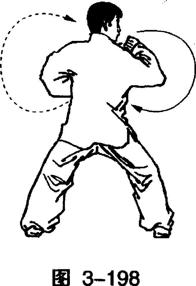 接上动作,右拳由下向外、向上、向里翻于胸前,拳心向 下,拳眼向后;左拳由上向外、向下、向里翻于腹前,拳心向 上,拳眼向前。目视前方。(图3-200)