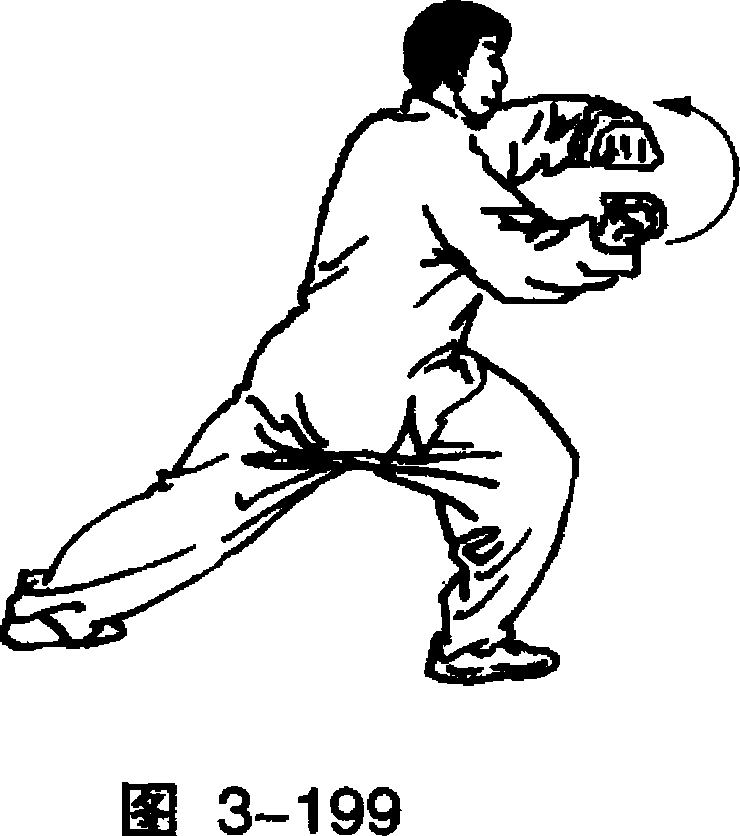 动作不停,右拳屈肘向后抱于胸前侧,拳心向下,拳面向 左,左拳向外、向前、向右贯击,拳心向下,拳面向右。目视 左拳方向。(图3-201)