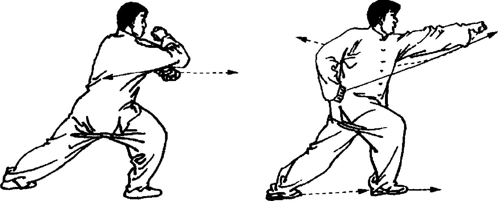 接上动作,身体重心右 移,上体右转成为右弓步; 同时,右拳向外、向下、向 里屈于腹前,拳心向上,拳 眼向前;左拳向外、向上、
