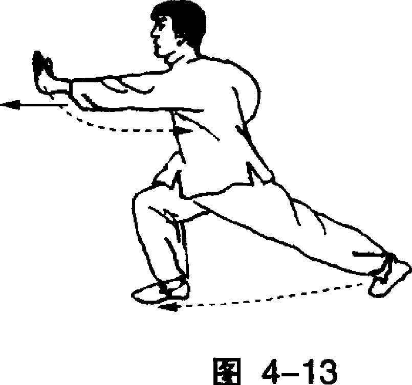 接上动作,身体重心右移, 右腿屈膝半蹲,左腿挺膝蹬直, 成为右弓步;同时,右掌屈肘收 于右腰侧,掌心向前上方;左掌 直臂向前立掌推出,高与肩平, 掌心向前,掌指向上。目视左掌 方向。(图4-13)