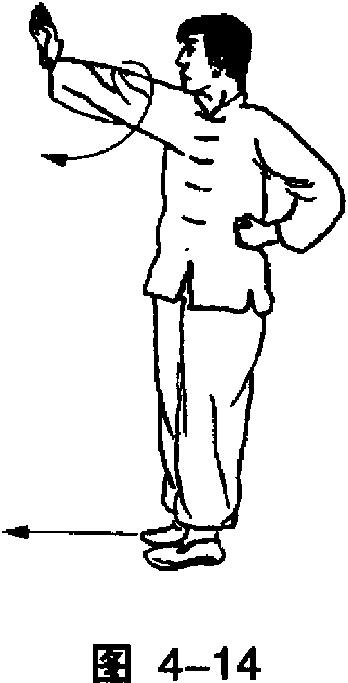 心向上;右掌向前上直臂立掌推击,高与眉平,掌心向前,掌 指向上。目视右掌方向。(图4-14)