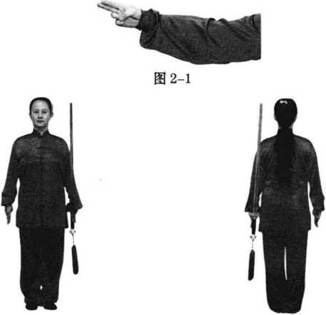 剑指:中指与食指伸直并拢,其余三指屈于手心,拇指压在无 名指和小指的第一指节上。(图2-1)
