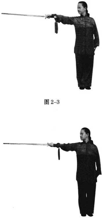 ②正握立剑:手握剑柄,拇指压于食指第二指节上,其余四指 并拢握紧剑柄,虎口、剑刃向上下。(图2-3)