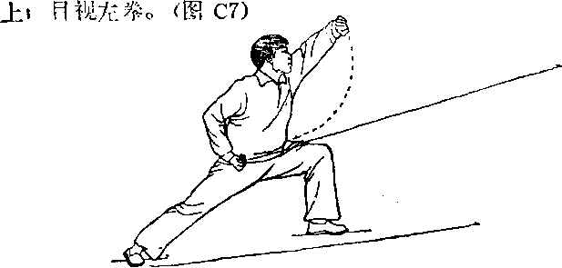 (1) 练法:①接上势不停,左脚向左前方迈一步,屈膝 前弓;右脚尖里扣,成左弓步同时,左前臂内旋,左拳由 上向下、向前、向上架起,置子头部左前上方,拳眼向下, 拳心向前,右拳屈肘下收置于右胁处,拳眼向外,拳心向