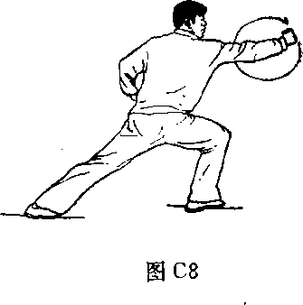 ②接上动不停,左脚不变, 右脚向前迈一大步,屈膝下弓, 成右弓步同时,右拳从右胁 处向前平冲,拳眼向上,拳心 向里,髙与右肩平,左拳屈肘 回收置于左胁处,拳眼向外, 拳心向上目视右拳。(图8) (2)要点:左拳上架要旋 臂转腕,右拳前冲要拧腰送