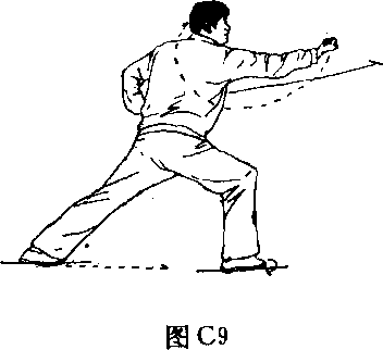 (1) 练法:①接上势不停,两脚步型不变;右拳屈肘由 前向下、向后、向上、再向前绕一小立圆翻腕下砸,拳眼向 外,拳心向上,高与右肩平;左拳不变;目视右拳。(图9)