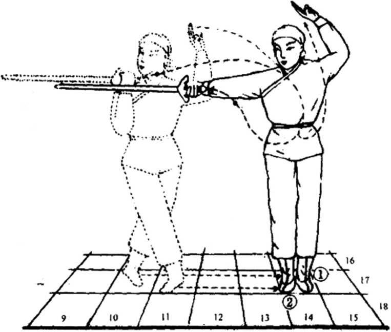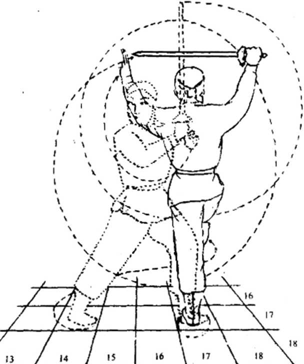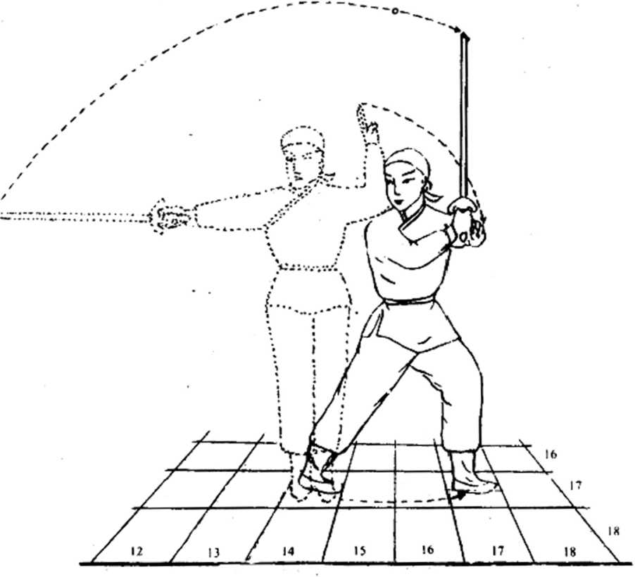 ①左脚向左方横跨一大步,右脚靠拢并立, 身体面对前方.②剑柄退至左肩处,与左手会合,左手推剑 柄,使剑向右方平剌,剑出后左手向左上方上扬。③目随剑视。④各动作同时进行。①左脚向左方横跨一大步,成弓步势。②剑柄翻转向左方抽削,剑身垂直,剑柄靠 左肩处。左手下行,指剑柄.③目视前右方。④各动作同时进行.①剑在身前翻滚一圆圈后,随步法运行横托 头顶上方,左手俟剑先行一周,继随步动身转,扬 右上方。②左脚向右后方转旋,使身体转180度,右 脚提起成独立势,面向后方。③目视剑运行.④各动作以剑先行一周,继配合手脚进行。