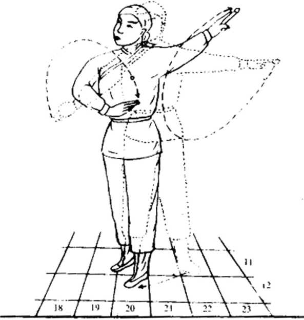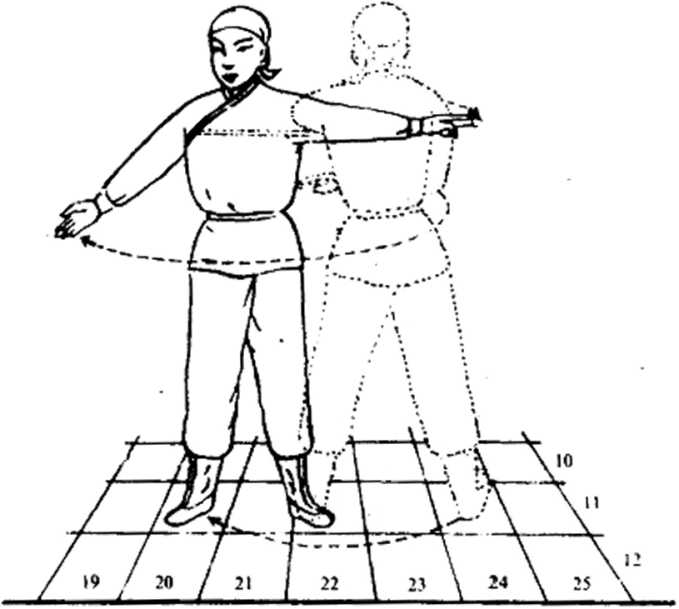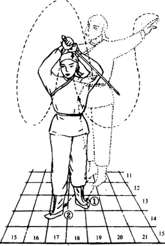 ①右脚向右方退进一步,身正向前。② 右手随身体旋转向右摆,掌心向外,左臂 伸平。③目视右手移动。④各动作同时进行。I-右脚不动,左脚向右前方进一步,脚尖点 地。2右掌向上转,变掌心向下,按F腹前。左 手由卜而上,微扬.③目仰视天空。?各动作进行时,手动作稍慢05由8至11势连成一气,止J:此势,①左脚向右前方进一步,右脚继上一步,成 丁字步.② 双手分由两侧由下而上举至头上方,右手 接剑.③目前视.④各动作同时进行。