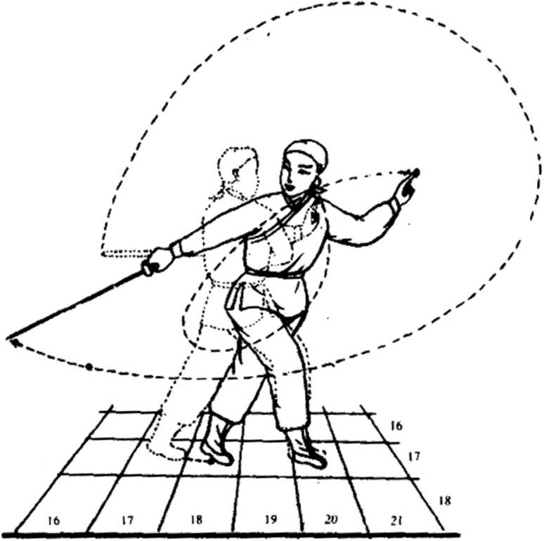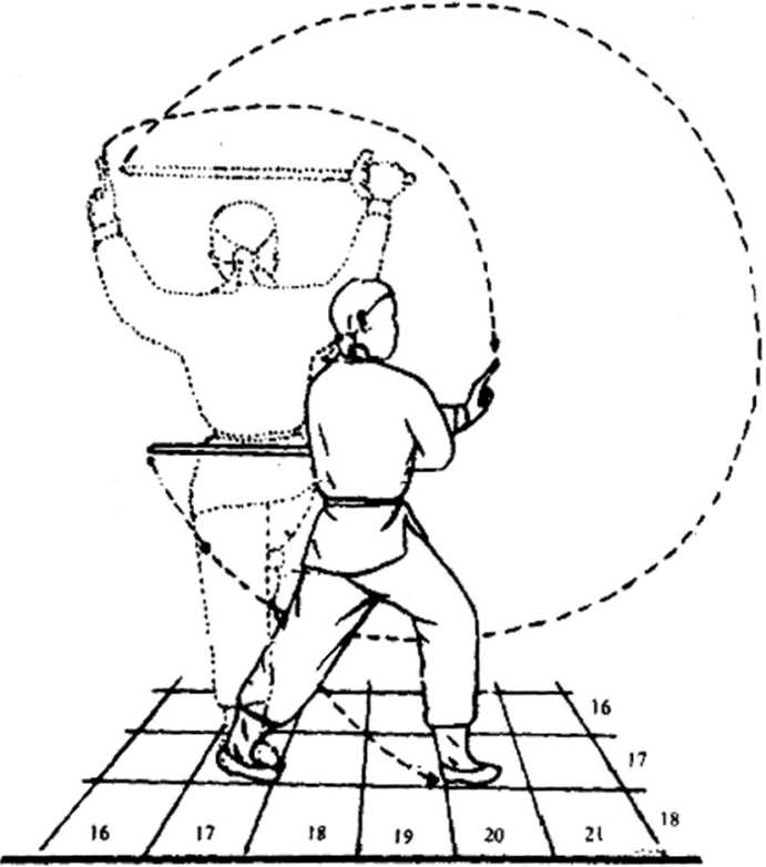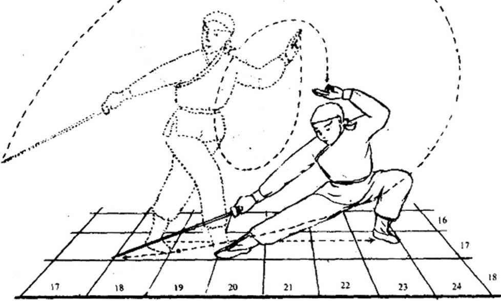 ①剑向左方劈转,横置左肋下,左手随步指 左方.②右脚下沉,向左方横进一大步,成弓步 如③目视左方.④各动作同时进行。①剑由左臂外经上方劈向左方,再向后撩, 左手由右臂外划运一周,然后指向左方.②右脚不动,左脚跟微提,身体稍上。③目视剑运行.④各动作同时进行.①右手翻转,手心向上,剑在身前削向左 方,再翻转抛砍右下方.左手在右臂内选行,继扬 指头额角。②左脚向左方迈进一大步,蹲下。右腿伸 直,脚面与腿平,成仆步势.③目随剑运行。④各动作同时进行.⑤ 由114至118势连成一气,止于此势。