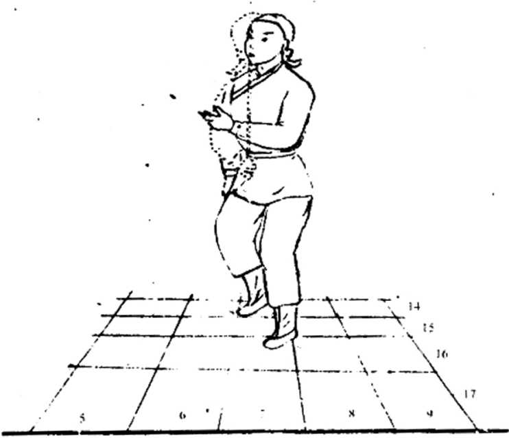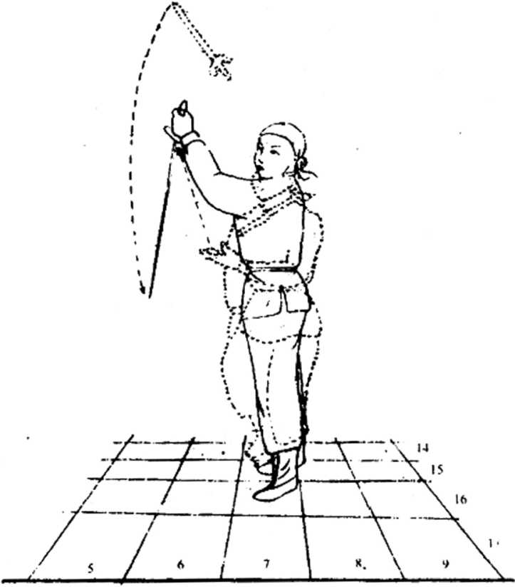 ①前势不动。②剑向上抛出,超过头顶。③目视剑。币抛剑时不可太用力,避免剑身过度翻滚。⑴左脚不动,右脚伸直站立;脚向前移少 许,两脚站丁字步。② 左手上伸接剑,剑锋自然F垂。③目视手接剑。④各动作同时进行。