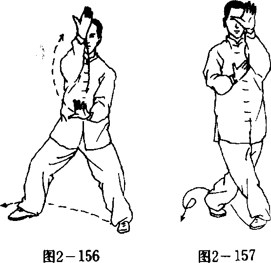 脚再往前迈一步,两腿屈曲成半骑马式;左掌由胸 前顺左腋下后插,再往胸前呈螺旋形屈肘上穿;右 掌臂内含滚裹之力,由身后往胸前,再往身后平行 画弧至胸前,再从左肘下上挑前穿,掌心向内;左 掌由右肘下往胸前竖掌推出。整个动作应自然合顺, 连贯一气,眼看前方。(图2—156)