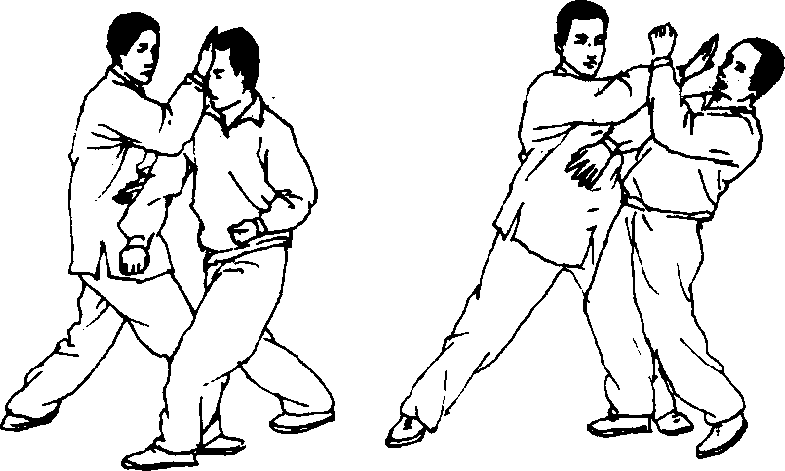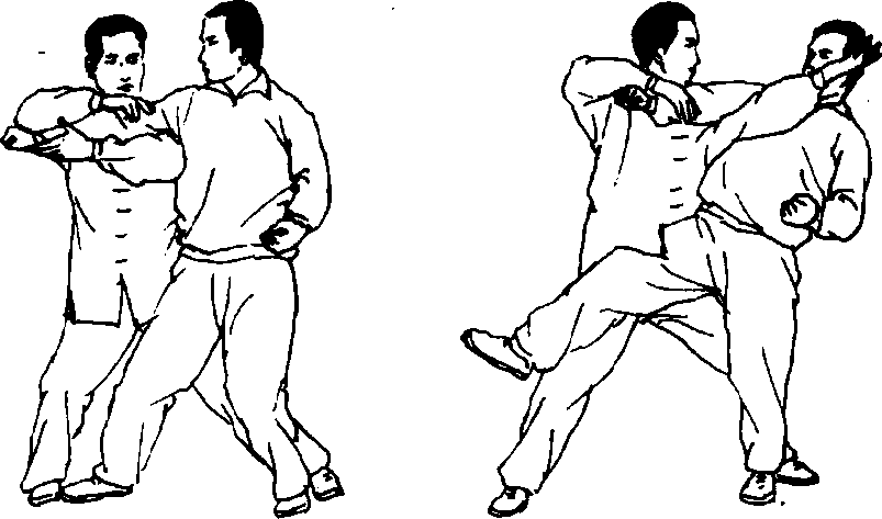 甲上右脚,伸右拳斜形栽击乙腹部;乙左脚往 甲右腿外侧微移一步,同时侧转身躯,用左掌由上 往下再往右斜下方掳甲右臂,同时进右脚,抬右手 拍击甲面部(图3—5);甲受到乙右掌攻击必将右臂 上抬护自己面门或伸左掌招架乙右掌;此时,乙左 腿速迈到甲左腿跟后或右脚后,身体随之前移,用 左肩撞甲胸肋部,左腿一弓,右掌回落,乙左掌沿 甲臂下斜刮一挑,将甲击出。(图3 — 6)