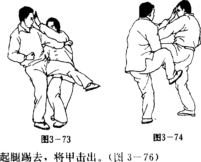 乙左脚前进一步,用双拳从左右两侧击甲两腮, 甲右腿或左腿前迈一步,伸双掌由由架住乙双拳;乙 双拳合拢,以两掌分别向下变掌掳带,并向甲腹部 I