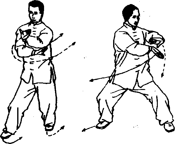 接上动,左脚往外微摆,右脚微扣,随之身体 往左稍扭转.右掌随身体扭转时向内旋转,并从右 往左画弧,屈肘推出,掌心斜向外,拇指外侧朝上; 左掌内旋,由右往左带回,再朝左推出,掌心斜向 上,掌拇指侧朝下手两腿屈曲成骑马式,眼看两掌。