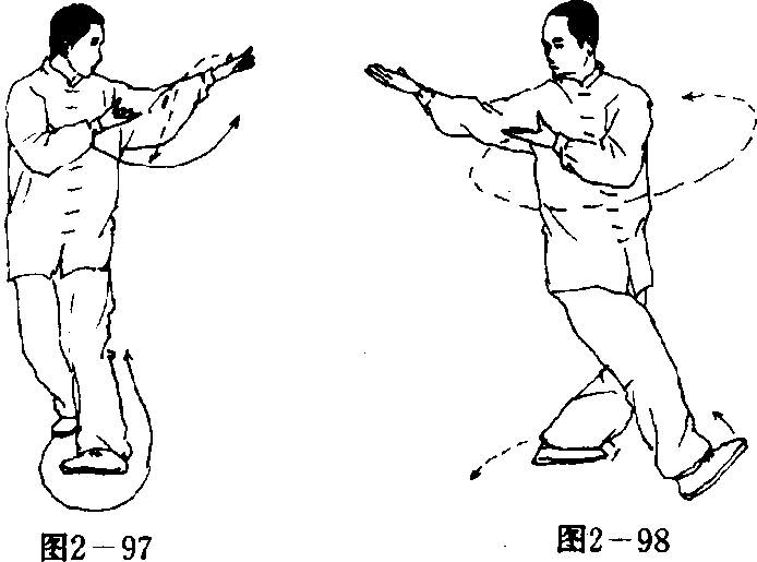 左脚尖外摆,右脚往左脚前踢右跛脚,脚尖粉 起,脚跟着地,右掌往左掌下前穿,同时向身右后 方弧形屈肘平摆,内含格滚之力,左掌则随右掌横 摆屈肘下移至右肘下端,腰向右后要极力拧转,两? 73 ?掌心仍向上,眼看右堂。(图2 — 98)