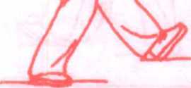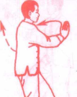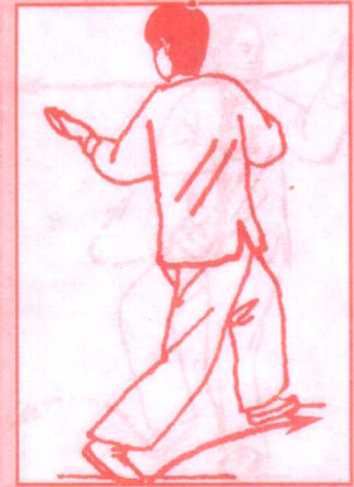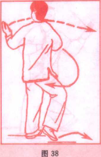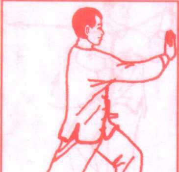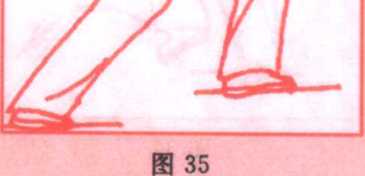 (2) 上体左转,左脚向前(偏左)迈出成弓步;同时右臂屈回, 右手由右耳侧向前推出,高与鼻尖平,左手向下由左膝前搂过落 于左胯旁;眼看右手手指。(图35)