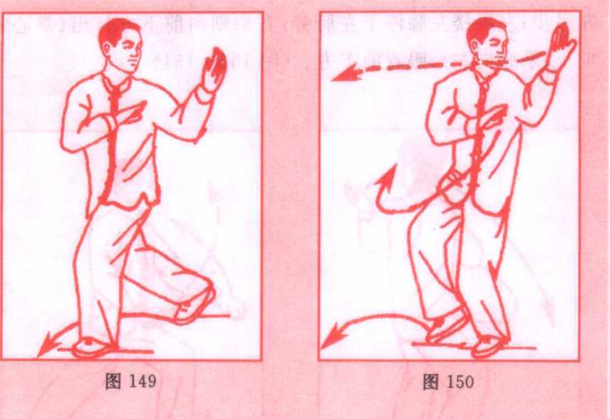 进步栽捶式身体重心略向后移,右脚尖外撇,身体右转,同时,左手...