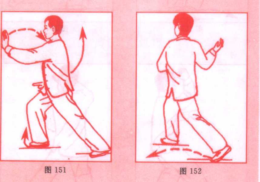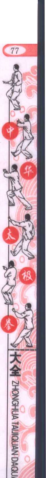 三、进步栽捶式身体重心略向后移,右脚尖外撇,身体右转,同时,左手随转 体落于右肩前,右手向右后方上举变拳;然后左脚前进一步,成|八十八式太极拳第2版