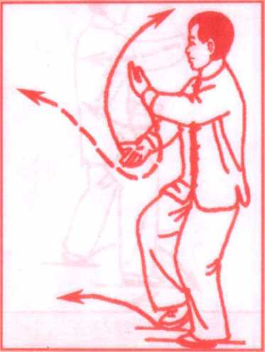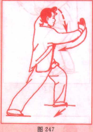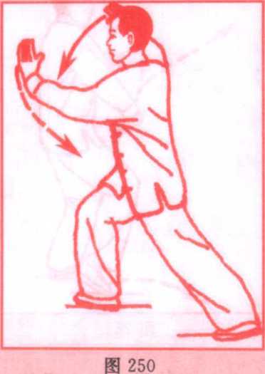 右前臂经胸前,手心朝下,两手相对成抱球 状,然后左脚向左前方迈出一步,成左弓步;左手上举置于左额 前,手心斜向上;右手则向前推出;眼看右手。(图246、247)(4) 身体重心移于右腿,左脚尖里扣,身体向后转,右脚收至 左脚内侧,脚尖点地;同时左手下落,手心向下,前臂平屈,右手 划弧收至腹前,与左手成抱球状,然后以左脚掌为轴,身体再向 右后转,右转向右前方迈出一步,成右弓步;同时右手上举置于 右额前,手心斜向上;左手则向前推出;眼看左手。(图248?250)??