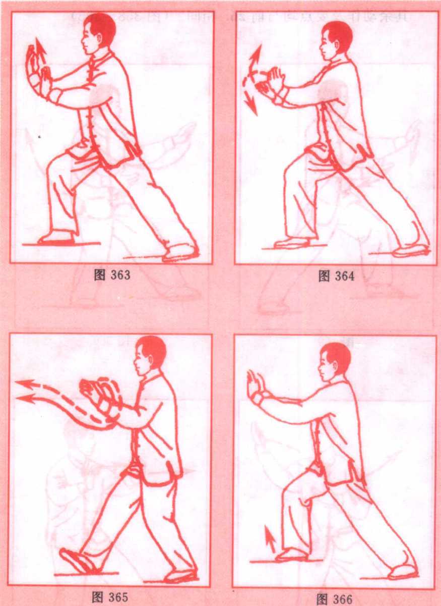 身体重心略向后移,左脚尖外撇,上体左转,同时右拳变掌 收在腹前,手心向上,左手向左后方再向上划弧,与右手相抱(左 上右手),同时右脚跟步至左脚内侧,脚尖着地(熟练后,可不点地);眼看左手。(图356、357)其余动作及要点均与前26?相同。(图358?365)图359图361图362八十八炙太极摹其余动作及要点均与前26?相同。(图358?365)图359图361图362八十八炙太极摹79?单鞭势式动作及要点均与前4?相同。(图366?371)79?单鞭势式动作及要点均与前4?相同。(图366?371)